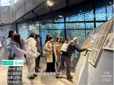 师生一行走进之江文化中心——这座浙江省规模最大的公共文化设施以“山水共构”为理念,将四馆融为一体,建筑群依《富春山居图》意境展开布局,曲面屋顶与通透玻璃幕墙共同勾勒出“山峦叠翠”的抽象意象,使同学们亲身感受到建筑如何将自然元素转化为视觉语言。随后探访的中国美术学院象山校区,更以中国传统美学、建筑哲学与生态理念的深度交融,为同学们呈现出一座“行走的露天博物馆”与“立体美学绘本”。每一处转角、每一片瓦檐,都成为视觉传达教学的生动案例。
