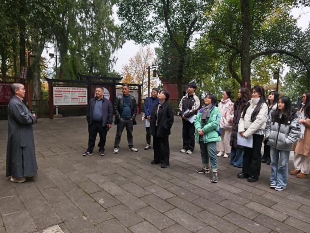 此次教研活动紧扣采风主题,以调研东部经开区“孝善”文化元素为主,首站抵达真佛山景区。作为川东地区孝善文化的核心载体,真佛山以“孝”立山、以“善”育人,古建筑群中蕴含的木雕、石刻、楹联等艺术元素,生动诠释了孝亲敬老、崇德向善的传统美德。师生们沿登山步道拾级而上,细致观察建筑形制与装饰细节,近距离感受“二十四孝”文化故事的精神内核,为孝善文化主题书画创作积累鲜活素材。