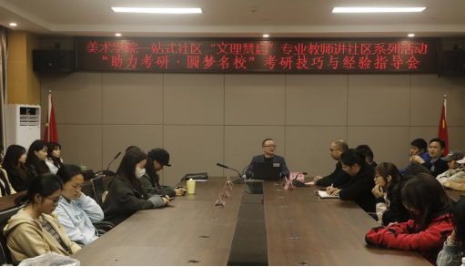 为深入推进“一站式”学生社区建设,落实专业教师进社区育人举措,美术学院于3月31日19:00在艺术传媒大楼1012会议室顺利开展“文理慧启”专业教师进社区系列活动。学院院长王赠怡、党委副书记王斌、学工办主任贺艳洁、专职辅导员胡培兵、王兆旺及部分考研学子参加活动。