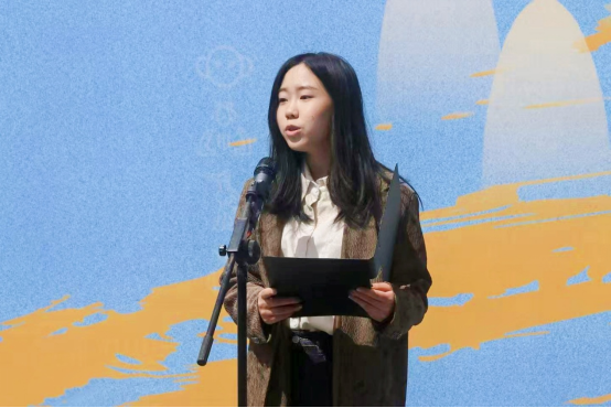 毕业创作指导教师代表刘馨雨在发言中分享了教学感悟与期许,回顾了陪伴同学们从构思雏形到成品落地的点滴历程。毕业生代表、服装与服饰设计专业学生谭敏杭则讲述了创作心路,对学校、老师的培养表达了诚挚感恩。