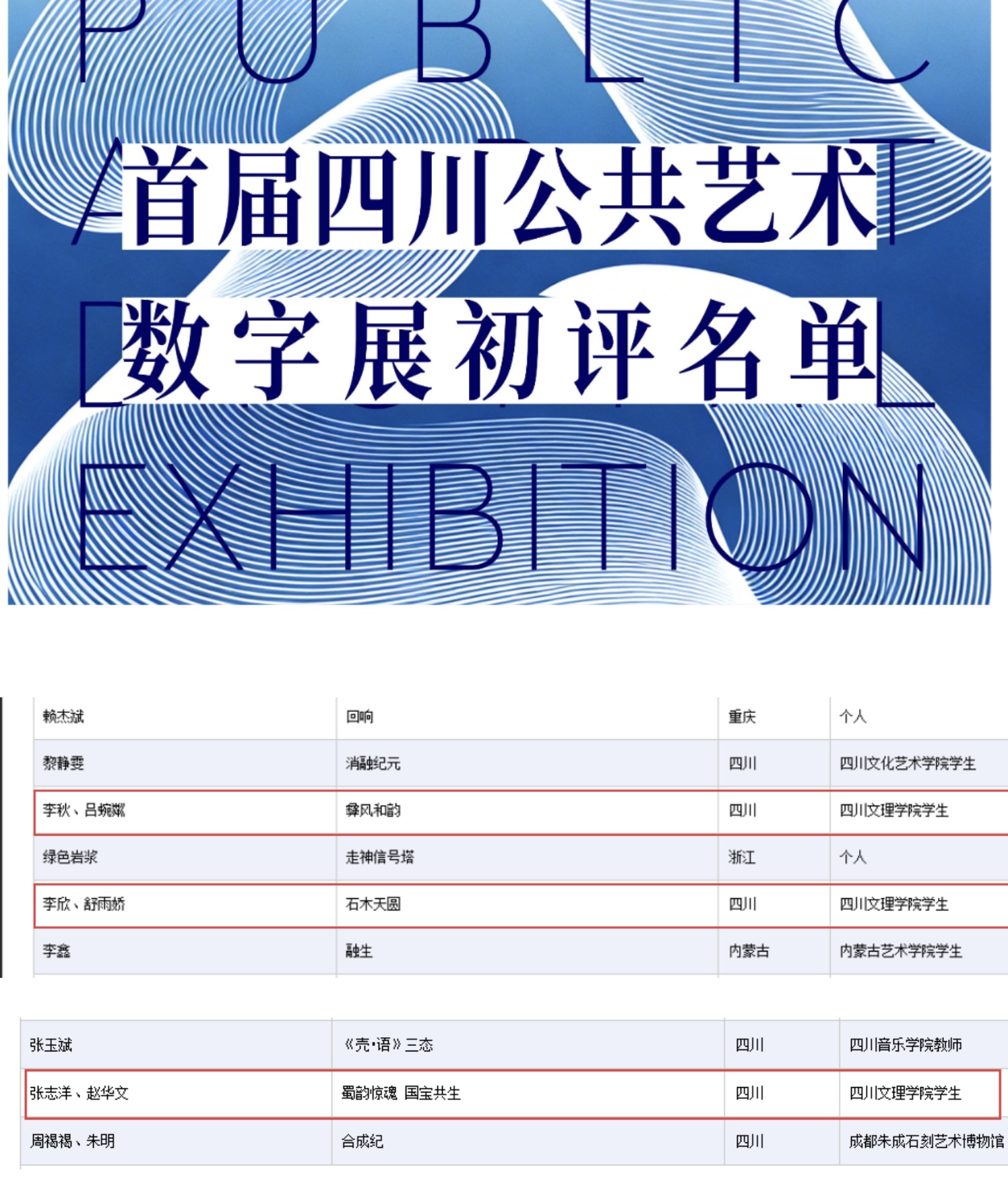 本次展览面向全国征稿,以“公共性、在地性、艺术性”为内核,借数字媒介搭建公共艺术交流平台,吸引了全国众多高校及创作者参与竞争。我院李秋、吕婉粼、张志洋等同学的作品凭借独特的创作理念、成熟的设计表达,在众多作品中脱颖而出,成功入围雕塑类等板块的初评名单。